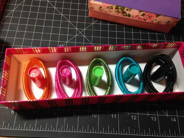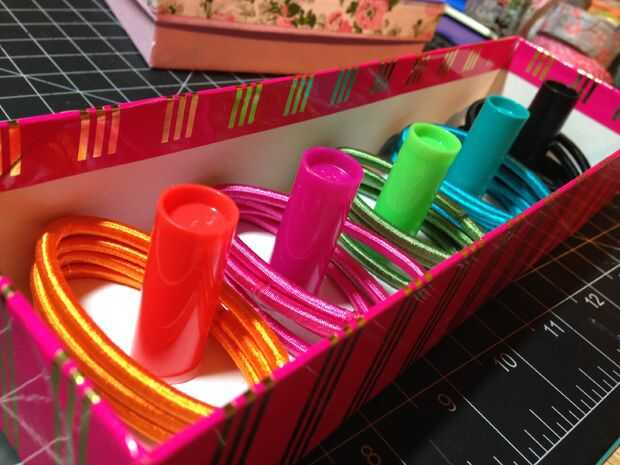 Para decorar la caja, puede utilizar Washi Tape alrededor de los bordes. Color coordinar sus titulares de cola de caballo, colocando alrededor de la tapa o rollo de cinta del color deseado. Organizar tus horquillas en orden del arco iris en la tapa de espuma.