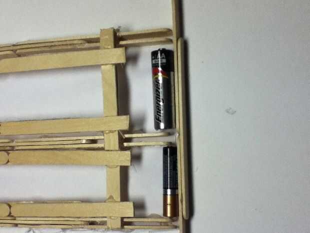 Primero poner un arreglo de palo de paleta a la parte inferior de las ranuras como se muestra en las fotos. Ahora solo pegamento un palito como se muestra en la imagen en un ángulo de 45 grados para coger las pilas cuando caen abajo de la ranura.