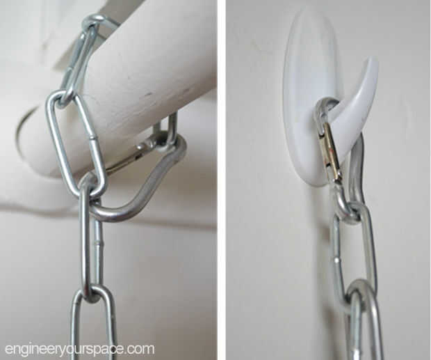 Para colgar la cadena, he usado un mosquetón (~$2.00 en cualquier ferretería) que funciona muy bien para colgar en un gancho o simplemente puede enrolle la cadena alrededor de la barra del armario y clip de la cadena en su lugar con el mosquetón.