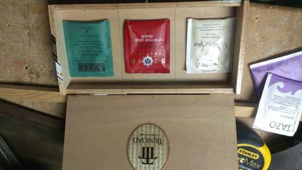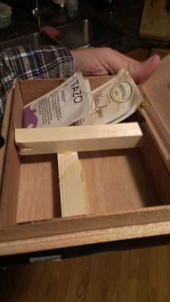 Tomar algunas bolsas de té y los ponen en la caja de cigarro que se ajustan por consiguiente. Decidí ir con una caja larga y delgada que se ajusta a 3 diferentes variedades de té bolsa acostado. Hice otro que caben cuatro variedades, pero se configuró para las bolsitas de té dispuestas en un ángulo (ver fotos) si tienes una configuración de caja/que las bolsitas de té en posición plana, trazar líneas para separadores poner en el uso de un lápiz y una regla. ES DECIR Mi cuadro era 9 3/4 pulgadas de ancho me mide 3 segmentos iguales de alrededor de 3 1/4 pulgadas. (al final, cada 'celda' con la anchura mayor de los divisores fueron exactamente de 2 3/4 pulgadas de ancho y era un ajuste perfecto para una bolsa de té). Si quieres hacer un organizador que sostiene las bolsas de té en un ángulo, tienes que poner un segmento de espiga funcionando a lo largo de la parte inferior de la caja de izquierda a derecha para hacer 2 paradas para las bolsitas de té. Entonces, debe ser cortado un taco que corre arriba y abajo en el cuadro para separar las dos partes, creando 4 'células'