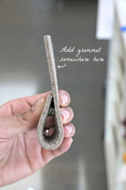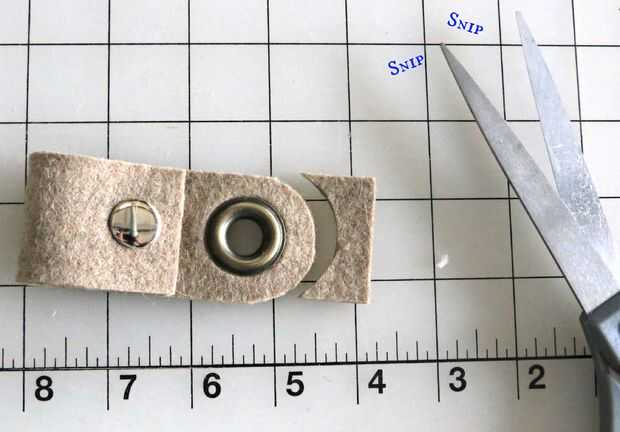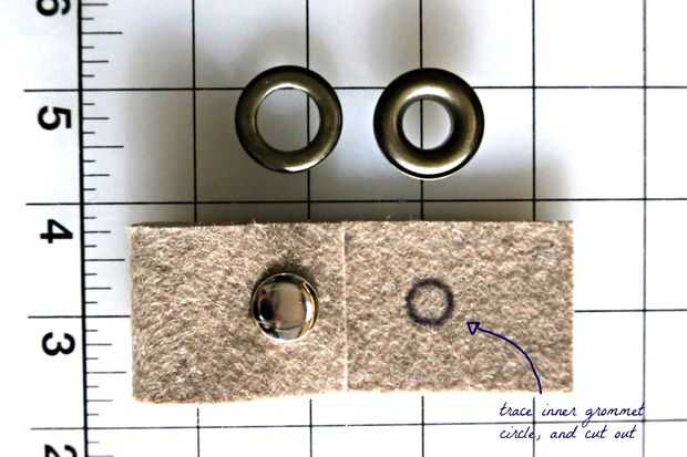 Usted notará que tienes un poco de cola en un extremo, y es donde ponemos la arandela. Usé el ojal de 1/2 pulgada en un acabado bronce. Trazar la circunferencia interior del ojal en su material y cortar un círculo áspero. Esto es algo complicado con 3mm fieltro o cuero, pero simplemente tome su tiempo. Debe ser capaz de mover en la pieza superior de su ojal en el agujero. En la parte trasera, coloque el extremo aspectos sobre la tela, y usando las herramientas de ojal y un martillo, usted será capaz a ambos extremos del ojal en el material del emparedado.