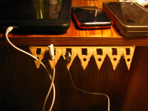 Un sostenedor de cable va en cada una de sus marcas. Use una perforadora para hacer un círculo. Esto es donde los cables se ejecutan a través de. Sin embargo, si usted pensó, mayoría de los cables sería capaz caber a través de él porque los enchufes son más grandes que el agujero. Usted necesita cortar un cuadrado sobre el círculo donde se insertarán los cables. Luego, cortar una línea recta que une el cuadrado y el círculo para que, una vez que el cable se inserta a través de la Plaza, que no caiga al suelo. Esperemos que esto tiene sentido...