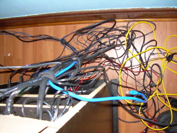 cada escritorio en mi oficina tiene un mínimo de 3 monitores un teclado y un ratón. Cada monitor tiene 2 cables a él (uno por uno de potencia de señal) y la mayoría de nosotros que lo chicos también tienen muchos cables usb funcionando todo tan bien.