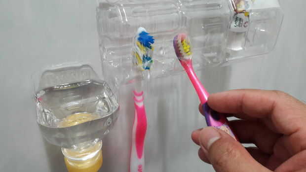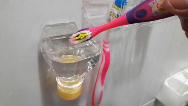 Después enjuaga su cepillo de dientes con agua del grifo, le pregunto a la cerda en la solución antes de ponerlo en la ranura. Le digo que matará a los gérmenes. La próxima vez que ella cepilla sus dientes, ella sabrá que su cepillo de dientes siempre esté limpio y libre de gérmenes.