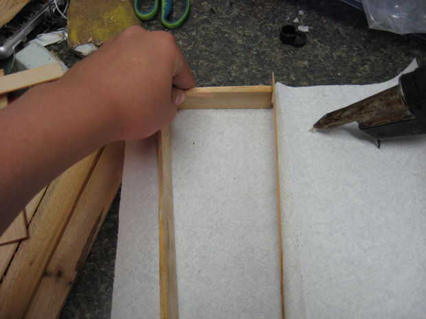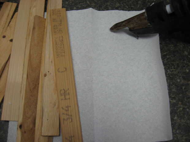 en primer lugar, usted va a necesitar una pistola de pegamento caliente y algunos restos de madera. usted necesita cortar la madera a la longitud deseada y luego lo pegan. Para los míos, tuve dos piezas largo con un pedazo corto de 3 pulgadas entre ellos cada aproximadamente una pulgada.