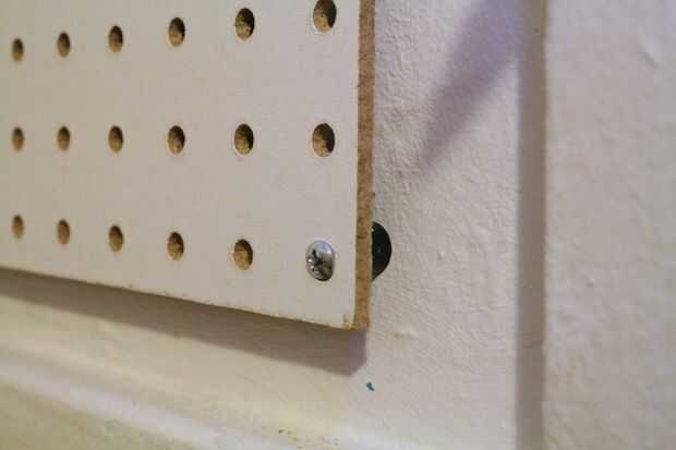 Tuve un pegboard sobra de 2 x 4 de mi pantalla Feria de artesanía que decidí utilizar para colgar almacenaje. Pensé al principio que podría necesito cortar la pegboard a su tamaño, pero cabe perfectamente!