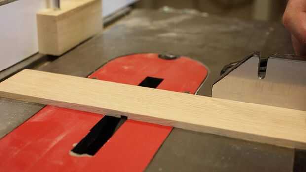Montaje del organizador de cubiertos va a ser mucho más sencillo si contamos con rebajos y mortajas para alineación y adecuado ajuste. ¿Recuerda toda meta espesor 1/4" en el paso anterior? Usted necesita instalar una pila de dado de 1/4"(o utilizar un router de 1/4" bits) en la Sierra de mesa y corte un rebajo en los extremos de la parte delantera y las espalda tiras.
