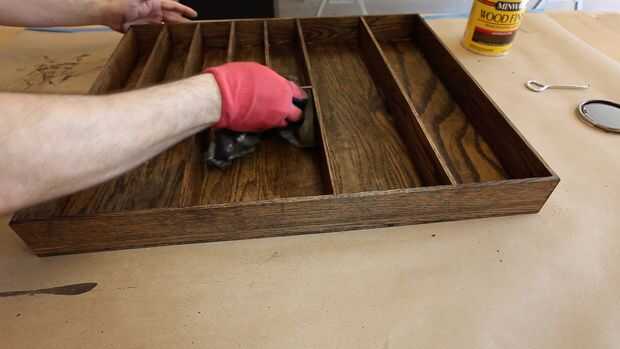 El último paso es terminar el organizador de cubiertos. Terminé mía con mancha de aceite Minwax jacobino. Elegí esa mancha porque es resistente al agua y coincide con la mancha de nuestros gabinetes y pisos muy cerca. Simplemente lo cubiertos con la laca de spray para proteger ese acabado. Me gusta rociar en un par de capas más ligeras, esperar 30 a 40 minutos y luego utilizar una lana de acero fina en él antes de aplicar la capa final.