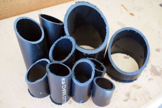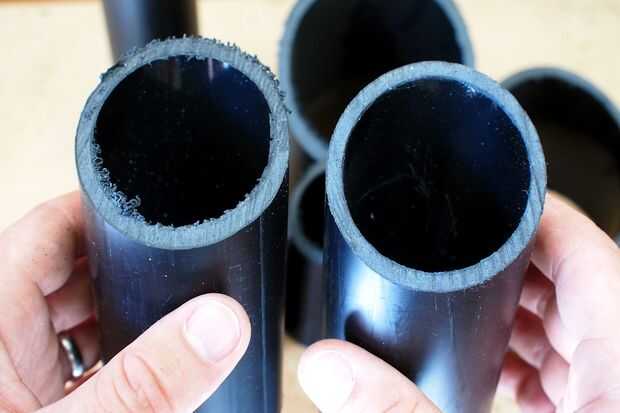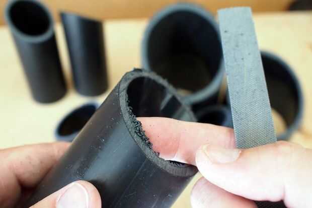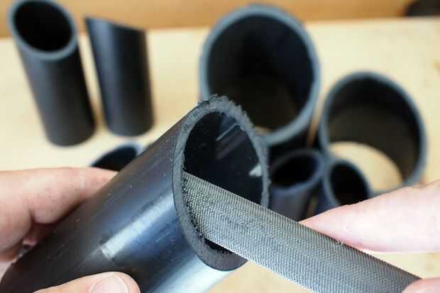 Después de aserrar las longitudes de tubería debían ser rebabas. Usó el lado áspero de un archivo para quitar la mayoría de las rebabas del plástico de los extremos de la tubería, luego cambia a la parte fina del archivo para crear un borde suave agradable.
