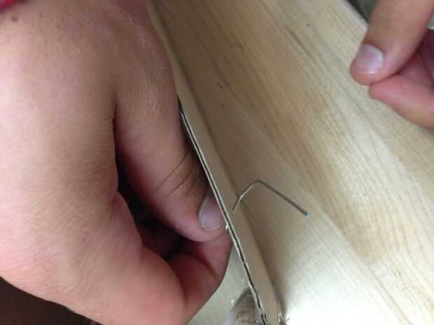 Inserte los clips de papel a través de la cara frontal de la cartulina aparte 8 en ambos ganchos "J" son capaces de sostener la ruler(s).