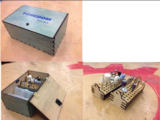 aquí es mi organizador de herramienta giratoria. Consiste en una caja de madera y un conjunto de bandejas extraíbles que sostienen los pedacitos rotatorios. Todas las partes fueron cortadas en el laser con la excepción de los herrajes de cierre, que fue hecho en una impresora 3d.