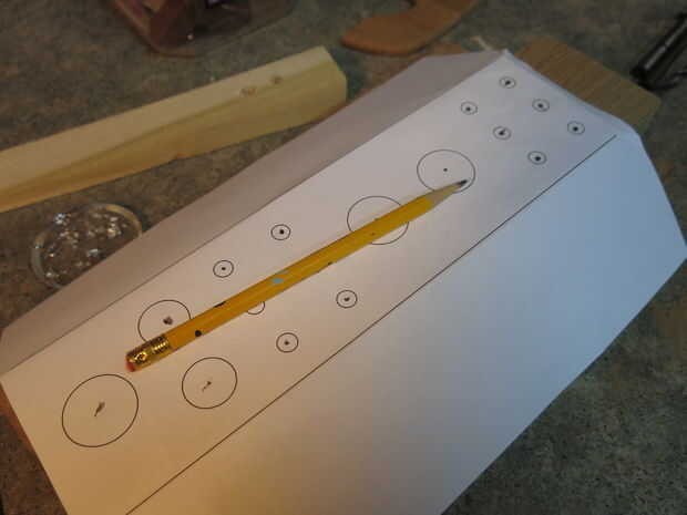 Ya que no estaba seguro sobre cómo quería que los orificios dispuestos, redacté un diseño en mi ordenador primero. Luego, alineó el diseño con la pieza de madera y poner puntos donde quería taladrar los agujeros.