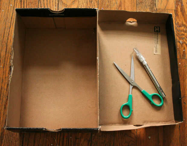 El primer paso en la fabricación de su organizador de herramientas de escritura es preparar tu caja de zapatos. Si tienes una caja de zapatos que tenga una tapa que sale fácilmente, usted puede apenas sacar la parte superior. O si tienes una caja de zapatos con un top atado, como en mi ejemplo anterior, cortan la parte superior con un par de tijeras o un cuchillo x-acto si su prefieren.