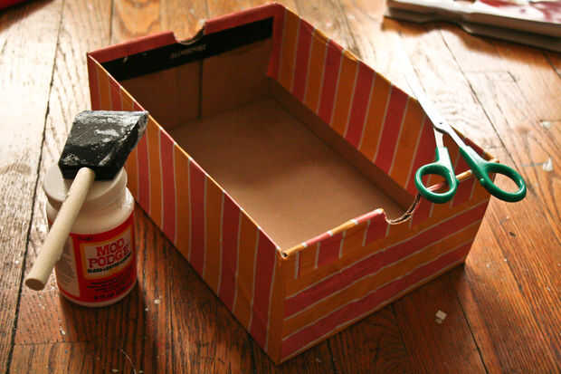 Ahora, para este siguiente paso, tomar algo de papel de embalaje y Mod Podge en su caja. Usé algunos pequeños cuadrados de papel enviados por Ronald McDonald House Charities. Cortar el papel sobrante, recortar a la medida y pegue todo en su lugar. Incluso puedes tomar algunas piezas adicionales de papel y se superponen varias lagunas para hacer patrones únicos funky!