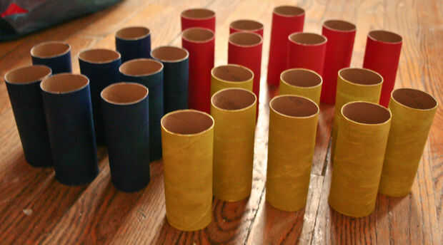 Ahora vienen los rollos de papel higiénico. Para este paso, puede dejar los rollos como es, o, como yo lo hice, puede pintarlos para añadir un estallido de color a tu agenda. La caja de zapatos que usé para el proyecto cuenta con 24 rollos. Por lo tanto, usé, por esta parte, 3 colores de pintura acrílica y pintados 8 rollos rojo, 8 rollos azul y 8 rollos amarillo.