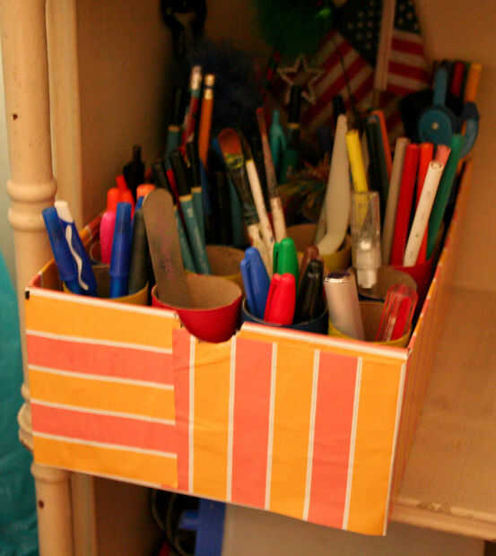 Ahora, los que hay izquierda hacer es agregar tus lápices, bolígrafos, marcadores, pinceles, lo que en su aseo rollos de papel y situado en una estantería! Perfecto! Ahora, usted puede Agregar acceso completo a todas tus herramientas de escritura y materiales escolares para sus tareas, elaboración y nota apuntar necesidades! ¡ Es increíble lo que puede hacer con una caja de zapatos vieja y reutilización para algo más útil!