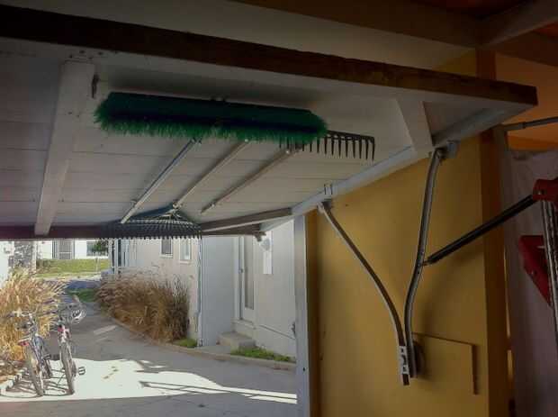 Para evitar que las herramientas caigan sobre su cabeza mientras la puerta está abierta, utilice 2 clips por el mango de la herramienta, uno en la parte superior y otro cerca de la parte inferior. Clips de tamaño mediano generalmente trabajan para escobas y rastrillos, pero verificar midiendo el diámetro de los mangos de la herramienta. Comprar el tamaño correcto de los clips según sus herramientas.
