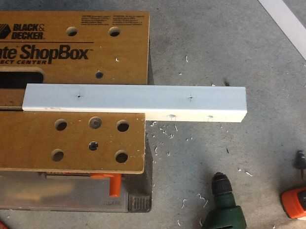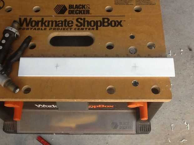 En el lado opuesto, marque una línea media de la longitud del lado. Marque un punto de 90 mm de cada extremo. Perfore agujeros para los tornillos en estos puntos.