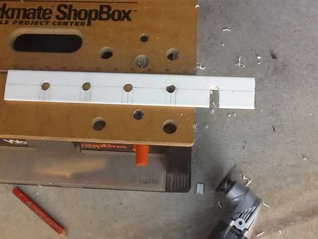 Usar la herramienta multiusos con hoja de sierra o sierra dentado fineza, para cortar los canales a lo largo de las líneas marcadas, desde el borde del material hasta el borde exterior de cada orificio.