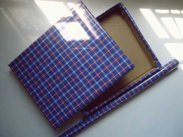Utilizando la misma técnica que he hecho una tapa. Cuando haces los cortes en las esquinas que le mantenga un poco más pequeño (1.5-2cm) de la caja. Luego envolver con tela o papel de regalo.