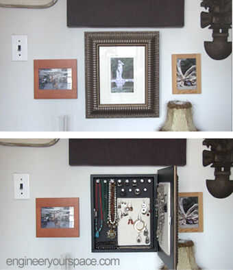 Mientras vivía en mi pequeño apartamento en Nueva York, no tengo mucho espacio de almacenamiento y tuve que ser creativo para almacenar y mantener mi joyería organizada. Quería una solución que se me da fácil acceso a mis joyas, mantener nuestro de vista pero no toma ningún espacio o espacio de cajón. Así surgió la idea de hacer mi propio custom colgante caja de joyería usando un marco - de que manera puedo colgar como parte de mi Galería de pared a doble pared arte, sin que nadie supiera a donde fui almacenando mis joyas!