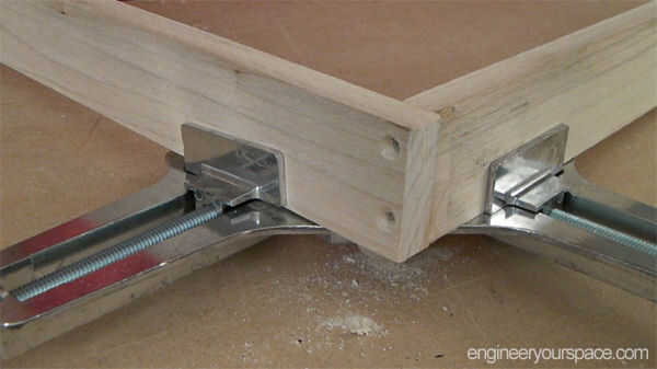 Usar una abrazadera de la esquina para unir las piezas resulta más fácil taladrar agujeros piloto (utilicé una broca de avellanar para empotrar las cabezas de los tornillos) y atorníllelos juntos. Antes de poner los tornillos, he añadido algunos pegamento para madera para una articulación más fuerte.