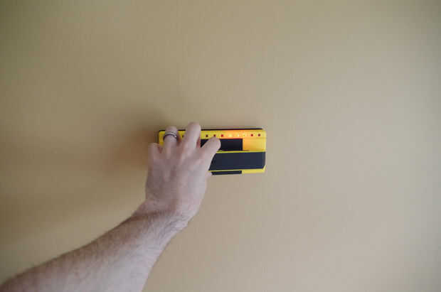 Primero que querrá utilizar un localizador de montantes para ubicar sus postes. Marqué los postes en dos lugares, uno cerca de donde la parte superior de donde iría el mueble y uno cerca de la parte inferior. Luego usé un nivel para conectar los sistemas de las marcas que me dieron a una guía de donde colgar el 1 "x 2" tiras de montaje.