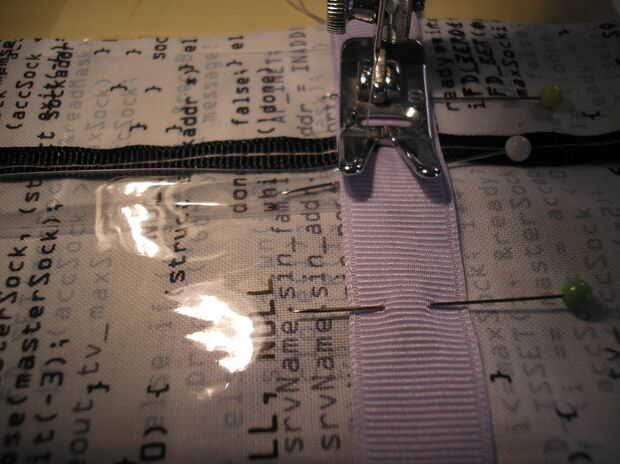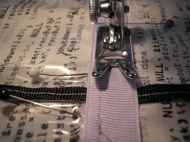 Pin cinta o moldura en parte inferior de los bolsillos. Usé cinta de grosgrain de 5/8 pulgadas. Asegúrese de que usted cubra la costura y el fondo del vinilo.