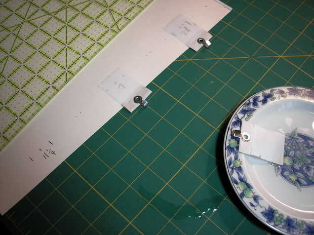 Siguiendo las instrucciones en el paquete, pegar los ganchos a la cara expuesta de etiqueta placa en 2 3/4 pulgadas, 7 pulgadas y 11 1/4 pulgadas.