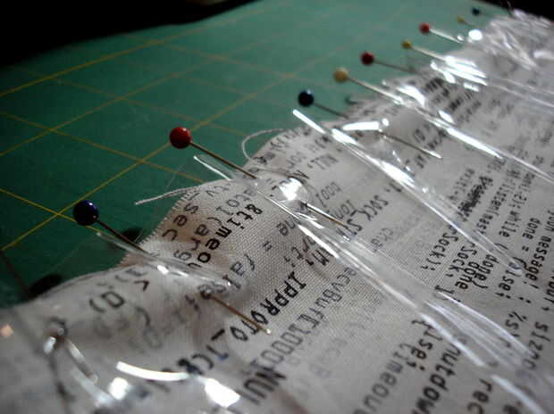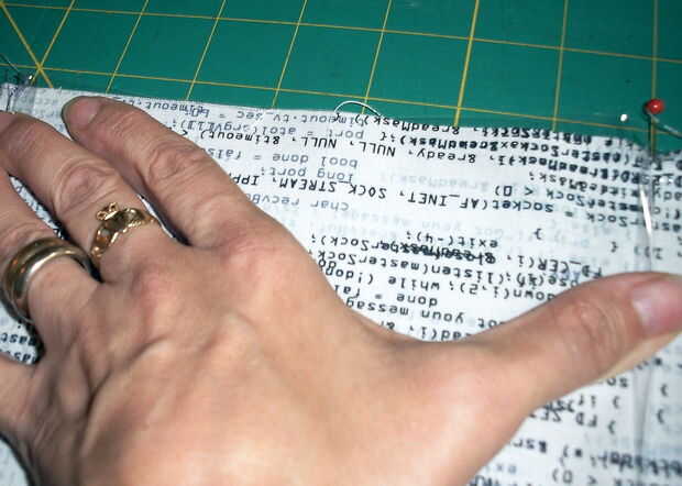 Coser el bolsillo con costura de 1/2 pulgada. El vinilo es un poco desigual ahora así que coser con el papel, la parte de tela hacia abajo.