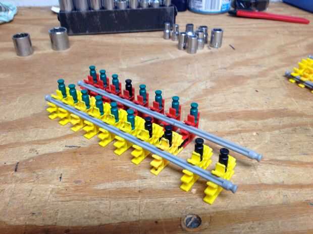 tomas de 3/8 ajuste realmente muy bien en la parte cuadrada de la pieza del conector, y 1/4 zócalos caben justo en las barras verdes pequeñas. Para sockets profunda utilice blanco en lugar del verde.