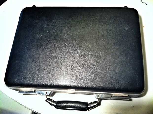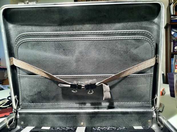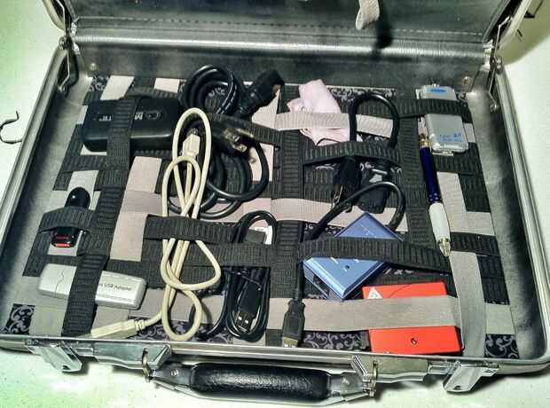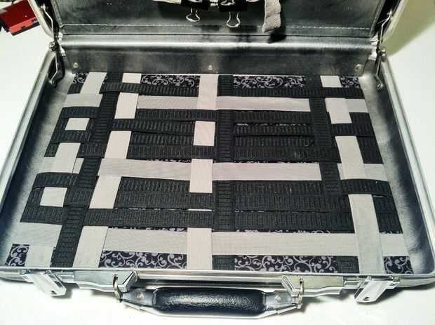 Ahora se pega la Junta a la maleta. Usé una cantidad generosa de pegamento para este paso. No quiero a soltarse aunque si lo hiciera no creo que un acuerdo sería demasiado grande. Una vez que el pegamento se seca está listo para organizar su equipo.