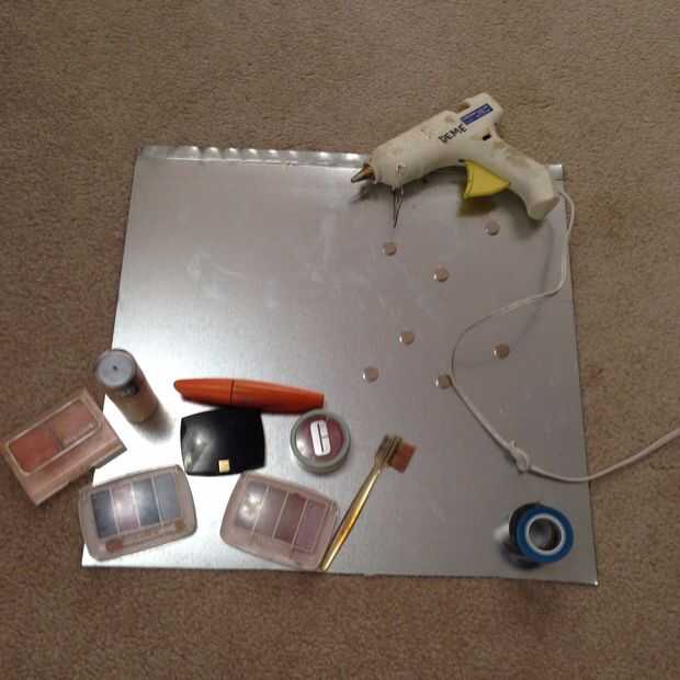 odio el desorden. Y un lugar tengo mucho desorden en mi bolsa de maquillaje. Inspirado por un instructible por deathrouge usuario, decidí tratar de hacer mi propia tabla de maquillaje. Tenía una hoja de galleta que se dirigía a la basura que era idea