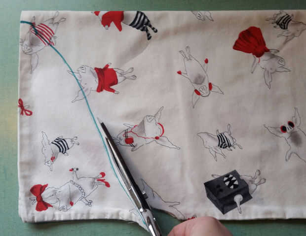 Doblar la funda de almohada por la mitad y corte de los bordes acabados (no el borde doblado!) justo debajo de la línea trazada. Girar la funda de almohada de adentro hacia afuera y hierro plano.
