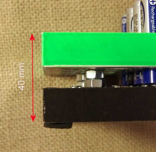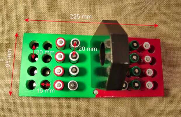 El tamaño total de la unidad es de 225 mm de longitud, 95 mm ancho y 40 mm de alto, sin el mango. El diámetro de los agujeros para las baterías es de 15 mm y la distancia entre los puntos del centro de las pilas es de 20 mm.