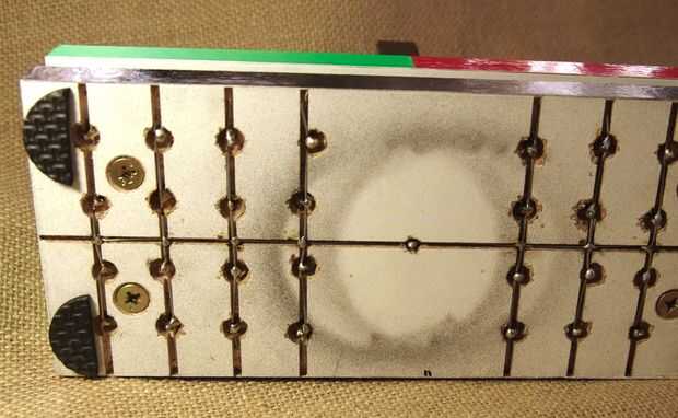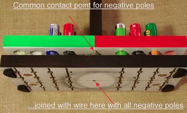 Se fijaron en la parte inferior de cada pila bien hasta 2,5 mm agujeros perforados a través de la cubierta inferior. Sus extremos salientes luego eran soldadas a los cables (tercera foto), que conectan finalmente a la común medida terminal (fotos cuarto y quinto).