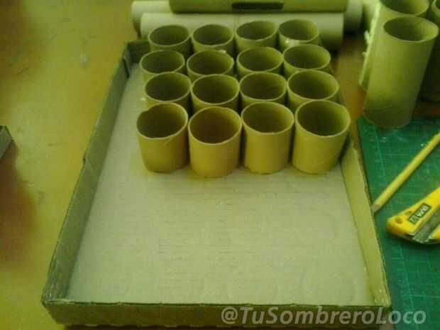 Unir los trozos de tubos de cartón con silicona uno al otro e ir introduciendo a la bandeja Los queden hacía los bordes de la bandeja, unirlos a la misma con grapas para fijar y dar fortaleza.