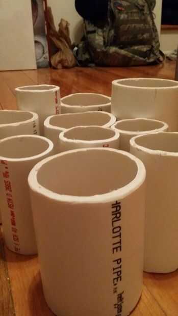 Cortar los tubos de pvc con un cutáneo y una cuchilla cada entre 5'' y 7-8'' hacerlas todas más o menos diferentes tamaños entonces enarenó ligeramente a las marcas de corte sigue dejando los diferentes cortes para efecto