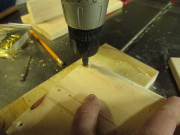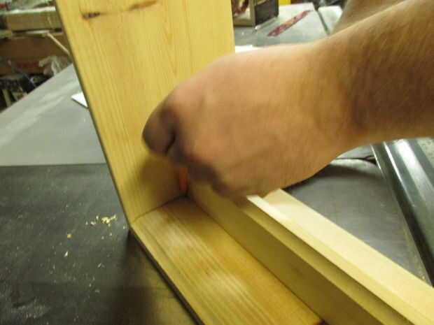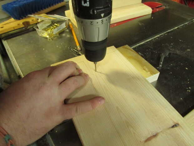 Tomar el tablero inferior, ahora con el refuerzo Unido y contra uno de la pieza lateral a tope. Con un lápiz marcar suavemente alrededor de la forma para colocar los tornillos. Hacer dos tableros laterales. Ver foto dos. Perfore los agujeros piloto primero, luego redrill con la broca avellanada. Tantos agujeros como usted siente que necesita.