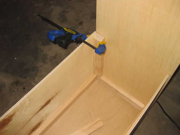 Línea de la esquina para que los paneles son agradables y al ras. Ajustar el soporte como se muestra. Conducir en los primeros clavos lo más cerca posible a la pinza porque se van a tratar y separar el la Junta del panel. Después de que el primer panel se clava en el soporte de la abrazadera del interruptor al otro panel en la esquina y clavo ese panel a la Junta. No hay necesidad para estos soportes de esquina para el marco. Repita estos pasos para las otras tres esquinas.