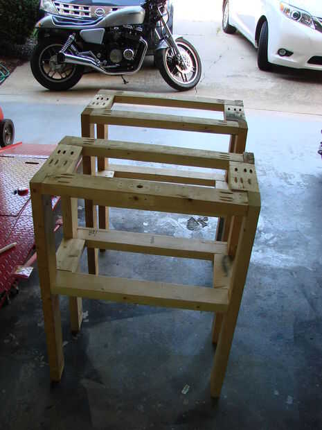 Ahora la parte delantera y patas traseras haz con abrazadera uno al otro con los rieles de 8" que los separa. Conducir todos los tornillos en la comprobación para Plaza y alineación a medida que avanza. Usted debe terminar con una completa tabla de extremo. Ahora repita el proceso para la segunda mesa final.