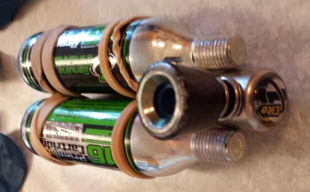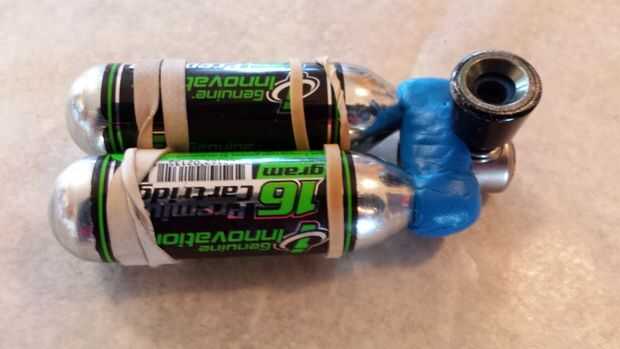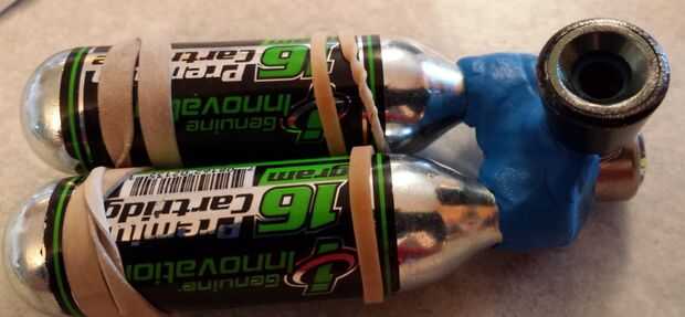Poner las gomas alrededor de los cartuchos de CO2 para mantenerlos constantes. Me aseguré que fueran incluso y nivel. Pruebe la colocación de la boquilla en allí para ver cómo orientar el producto final.