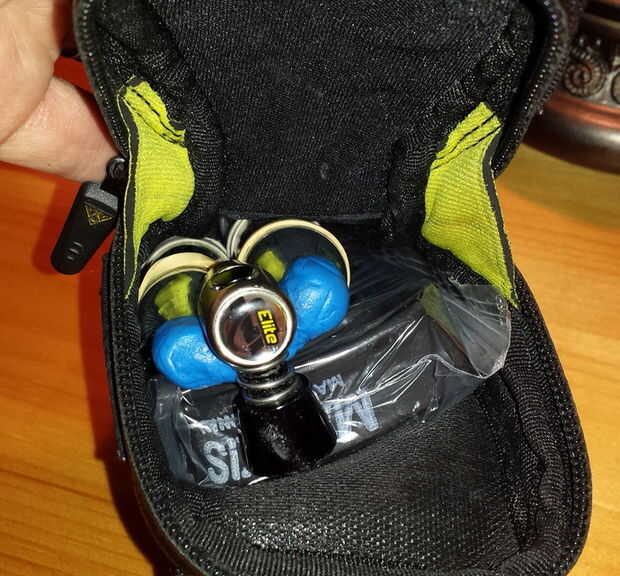 Espere la Sugru curar y poner todo el paquete en el bolso del asiento. Los extremos son seguros y la boquilla no se mueve.
