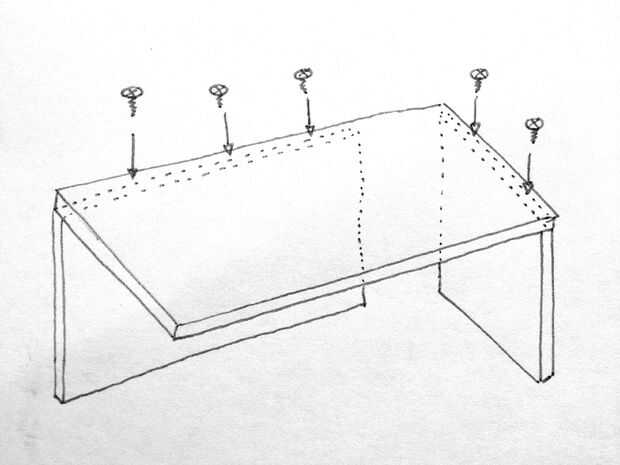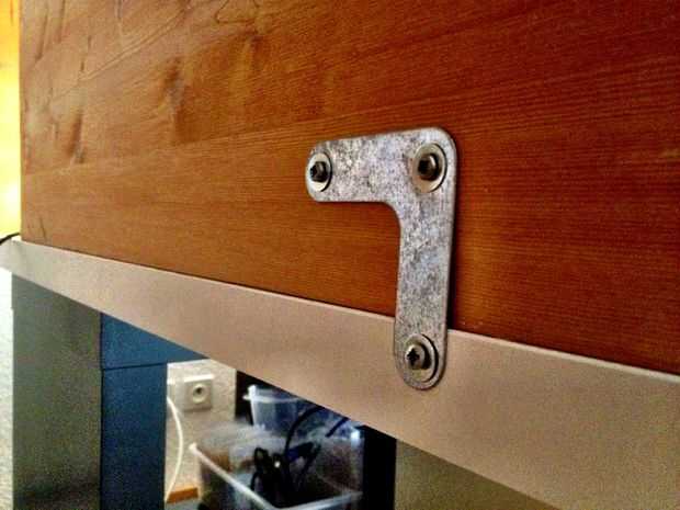 La estructura principal consta de 3 piezas. La cara, la espalda y la placa superior. Les fijé con tornillos (ver foto). Desde que está de pie en dos lados, fijo que a la mesa con 2 soportes (uno en la parte trasera) y otro en el lado derecho para evitar que inclinación o desplazamiento fuera de la mesa.
