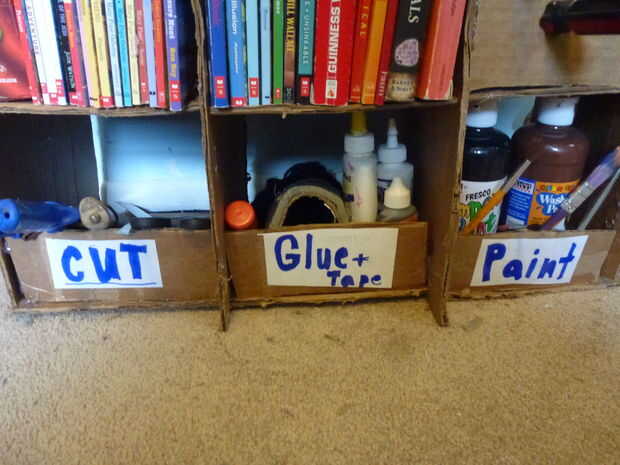 Herramienta de cubos– hice algunos compartimentos para almacenar suministros de pintura, herramientas de corte y pegamento y cinta. Cortar un rectángulo de 3 x 8 pulg. de cartón y pégalo en la parte inferior de uno de los cubbies. Entonces, todo lo que tienes que hacer es etiquetar los compartimientos.