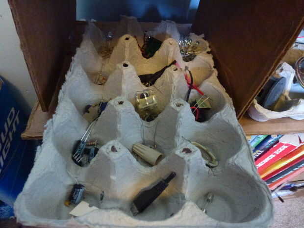Huevo Carton componente titular- este compartimiento es perfecto para almacenar los componentes electrónicos. Los agujeros de huevo en un cartón de huevos pueden alojar componentes pequeños de 5-6. Mayoría de los componentes es más oscura en color y un cartón de huevos, haciéndolos más fácil de encontrar. Para hacer este compartimiento, corte un pedazo de cartón de huevo 9" de largo. Fácilmente puede deslizar la caja hacia adentro y hacia afuera para la fácil localización.