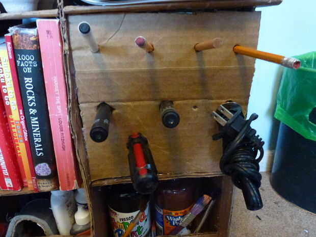 Lápiz/pluma/soldar hierro titular- este compartimiento utiliza agujeros en un cartón cuadrado para cómodamente guardar lápices, bolígrafos, soldadores y cualquier otro cilindro de diámetro pequeño. Cuut a un 8 "x 8" cuadrado de cartón y corte agujeros según el tamaño de los objetos que desea poner en él.
