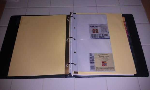 1. Tome el lado izquierdo de los insertos de carpetas del CD el uno con el agujero ya perforado en él y ponerlo en la carpeta y los divisores de papel de la etiqueta por el tipo de cupones que tienes. Ahora tienes un lugar para almacenar y organizar tus cupones en casa también.