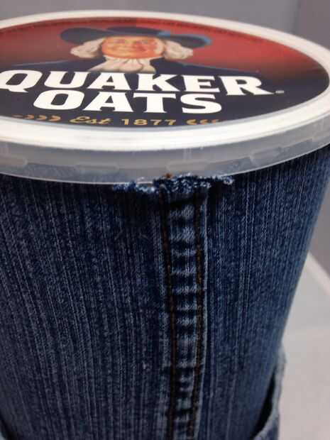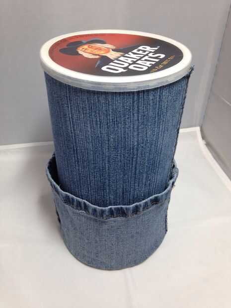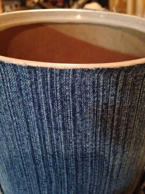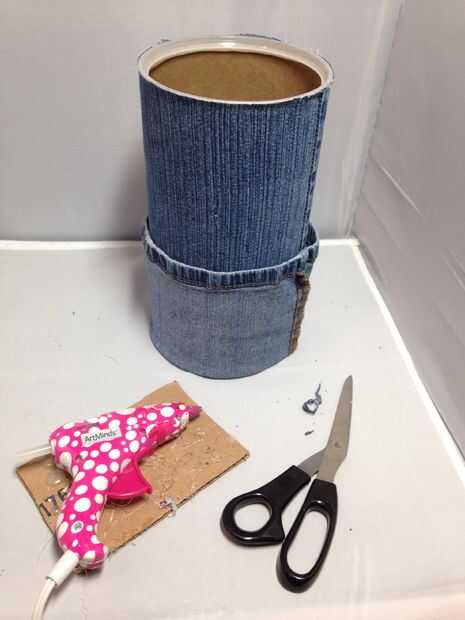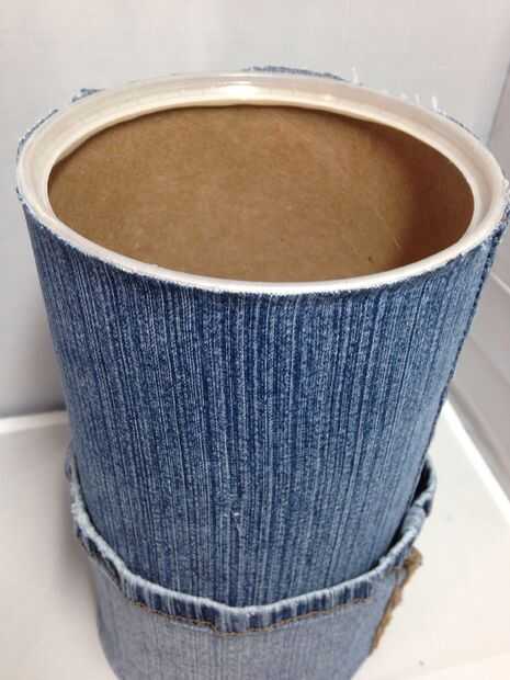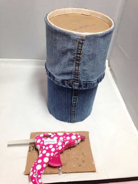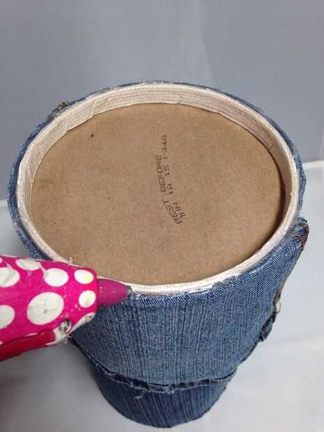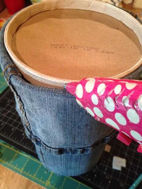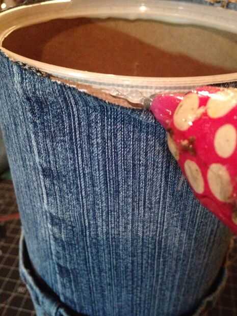 Por ahora, esperemos que tienes conectado tu pistola de pegamento caliente y calienta para arriba. En primer lugar, caliente pegamento en el borde superior del recipiente, tirando hacia atrás la parte superior de los pantalones vaqueros como vas y empuja hacia abajo sobre los pantalones vaqueros para asegurarse de que la tela se pega bien. Después de haber pegado el borde superior de la tela al recipiente, cortar la tela para hacer la tapa más fácilmente. Coloque la tapa sobre el envase para asegurarse de que encaja bien. Puede recortar más en el dobladillo de los pantalones vaqueros.