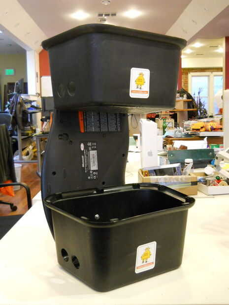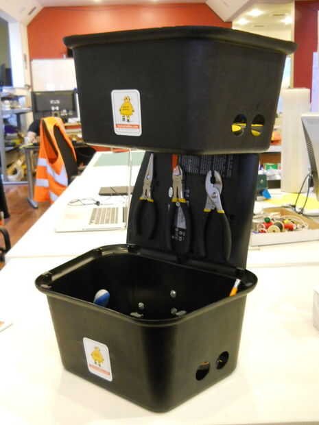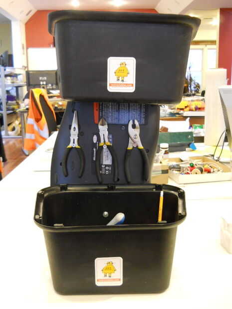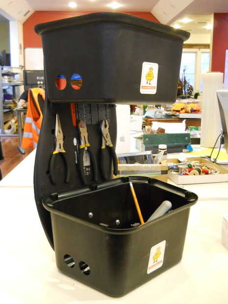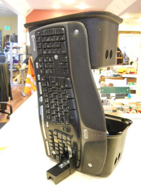 este es mi segundo instructivo de mi residencia artística, nacida de la necesidad de tener un organizador para mis herramientas y materiales. Así que aproveché un teclado ergonómico desechado, dos envases de plástico (con el colador de mi último instructivo, en el callejón trasero de un restaurante de chinos. Una vez más, no preguntes!), una pieza de plástico para equilibrio, pernos y tuercas; y he hecho un organizador básico con dos estantes. Me llevó veinte minutos y es una buena manera de reciclar el teclado dañado, importa la forma.